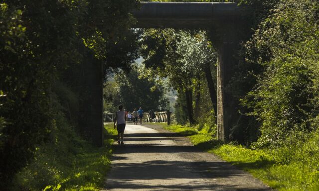 En Roces pasamos bajo la carretera de Oviedo/Uviéu, saliendo luego a una zona de abundantes polígonos industriales, que enseguida quedan atrás, conforme nos aproximamos a un trecho desde el que identificaremos el palacio de la duquesa de Riansares, en medio de una extensión arbórea de indudable interés ecológico. Arriba, a nuestra derecha, vemos alguna nave del polígono de La Vega, parroquia de Porceyo; aquí el arroyo viene a señalar la divisoria entre esta parroquia y la de La Pedrera, un buen lugar para reposar junto a la restaurada fuente La Pinganiella. Tras otro cruce, pasamos muy cerca de una quintana muy a destacar: la de Casa Rubiera, en La Pedrera, a la derecha de la vía verde.